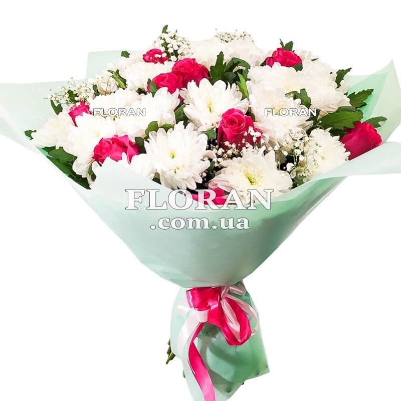 Троянди з хризантемами - код товару FL-1110. Букет з 9 рожевих і 18 хризантем буде чудовим поєднанням краси та витонченості. Рожеві троянди символізують нежність, романтику і любов. Вони є класичним вибором для вираження глибоких почуттів та емоцій. Рожевий колір також асоціюється з жіночністю, добротою і благородством. Хризантеми, у свою чергу, додають свіжості та яскравості в букет. Вони є символом радості, оптимізму та довголіття. Хризантеми доступні в різних кольорах, їх насиченість і текстура прекрасно поєднуються з трояндами. У цьому випадку білі та рожеві хризантеми можуть підчеркнути красоту рожевих троянд і створити враження виразності. Гіпсофіла, або як її ще називають мільйон зірок, додасть воздушности и легкости в композицию. Ее ніжні білі квіткові клубки створять ефект хмарності і придадуть букету вишуканості та романтичності.