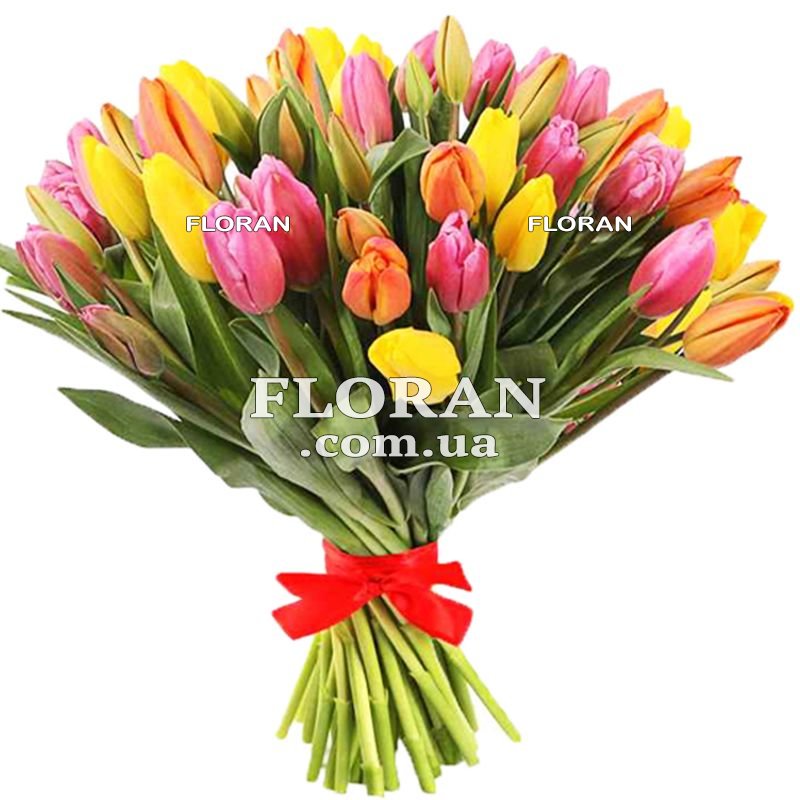 55 різнокольорових тюльпанів, стрічка або упаковка