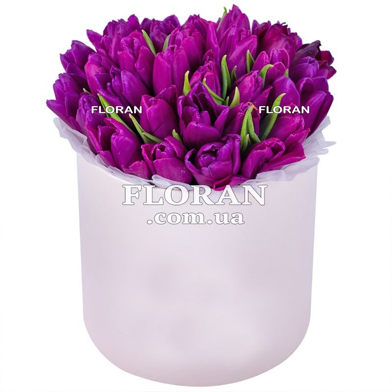 Тюльпани в капелюшній коробці - код товару FL-236. Це прекрасний подарунок для будь-якого випадку. Коробка тюльпанів - це незвичайний і красивий спосіб подарувати квіти. У цій коробці знаходяться 33 фіолетових тюльпана, які будуть радувати очі своєю красою і ароматом. З тюльпанів можна зробити прекрасний букет або розкласти їх окремо по кімнаті. Фіолетовий колір символізує розкіш, благородство і повагу. Коробка тюльпанів фіолетового кольору стане чудовою прикрасою будь-якого інтер'єру. Цей подарунок підійде для будь-якого випадку - від дня народження до весілля. Такий подарунок точно не залишиться непоміченим і принесе масу позитивних емоцій.