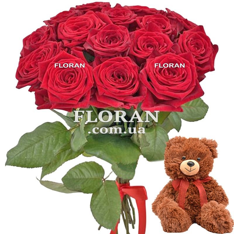 Ведмедик з букетом - код товару FL-540. Цей чудовий подарунок поєднує в собі плюшевого ведмедика та квіти. Прекрасний вибір подарунка для коханої людини! Цей подарунковий набір з 15 червоних троянд та ведмедика коричневого кольору 20-25 см точно сподобається вашій коханій. Червоні троянди символізують пристрасть та кохання, а м'який та милий ведмедик стане ніжним нагадуванням про вас. Цей подарунковий набір підходить для будь-яких свят та подій, від Дня Народження до Дня Святого Валентина. Впевнений, що цей набір подарунків заповнить серце вашої коханої теплом та затишком.
