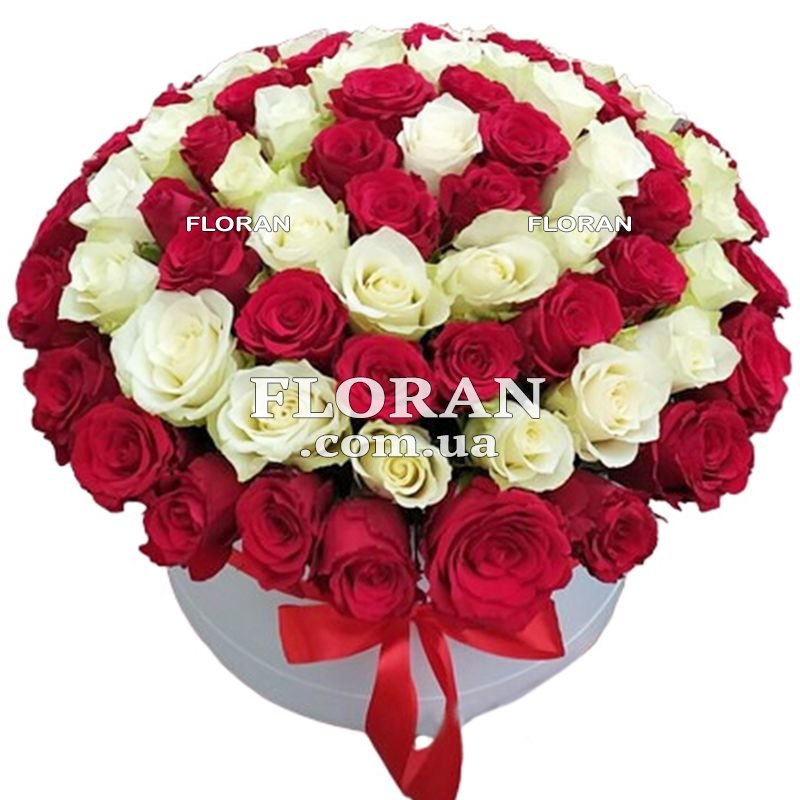 Велика коробка троянд - код товару FL-1802. Велика коробка троянд, в якій викладено 81 червону та білу імпортну троянду, є вражаючою композицією, здатною захопити і вразити своєю красою. Кожна троянда в цьому букеті є витвором мистецтва природи, а їх поєднання створює приголомшливий візуальний ефект. Червоні та білі троянди, укладені спіраллю, створюють елегантний та гармонійний образ. Червоні троянди символізують пристрасть, кохання та романтику, тоді як білі троянди уособлюють чистоту, ніжність та вічність. Їх з'єднання в одній композиції передає глибоке значення і висловлює особливі почуття. Велика коробка троянд підходить для особливих випадків та святкових моментів. Вона стане чудовим подарунком для ювілярів, романтичних побачень, днів народження чи інших особливих подій. Цей букет приверне увагу та викликає захоплення в одержувача. Наша служба доставки готова привезти цю чудову композицію троянд у великій коробці будь-куди. Незалежно від того, чи знаходитесь ви у великому місті чи невеликому селищі, ми забезпечимо доставку кур'єром прямо до дверей. Ми розуміємо, що кожен момент важливий, тому ми гарантуємо своєчасну та надійну доставку. Здивуйте та порадуйте своїх близьких, друзів або коханих цією чудовою композицією 81 червоної та білої троянд у великій коробці. Цей вражаючий та емоційний подарунок запам'ятається надовго та залишить яскраві враження у серцях усіх, хто його побачить.