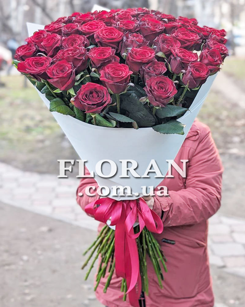 Великі червоні троянди – код товару FL-707. Уявіть собі чудовий букет великих червоних троянд, що складається з 51 прекрасної троянди. Цей букет є втіленням пристрасті, сили та елегантності. Червоні троянди вважаються символом глибокої любові та пристрасті. Їх насичений відтінок та витончена форма пелюсток привертають увагу та викликають захоплення. Букет із 51 червоної троянди створює приголомшливий ефект своєю розкішшю та вишуканістю.