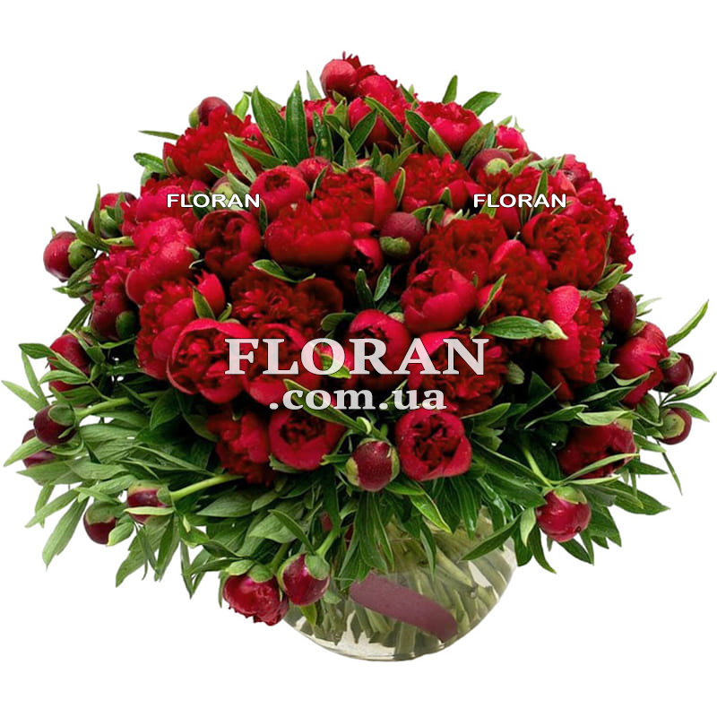 Великий букет квітів півонії - код товару FL-962. Великий букет із 65 місцевих червоних півонів - це чудовий подарунок, який уособлює пристрасть, силу та любов. Червоні півонії з їх яскравими, насиченими відтінками та пишними пелюстками, нададуть вашому букету вишуканості та елегантності. Кожен червоний півон у цьому букеті є символом пристрасті та глибоких почуттів. Вони переносять нас у світ сильних емоцій та романтичних моментів, наповнюючи повітря атмосферою кохання та спокуси. Червоний колір півонії є виразом гарячої та щирої пристрасті, що символізує сильні емоції та прихильність.