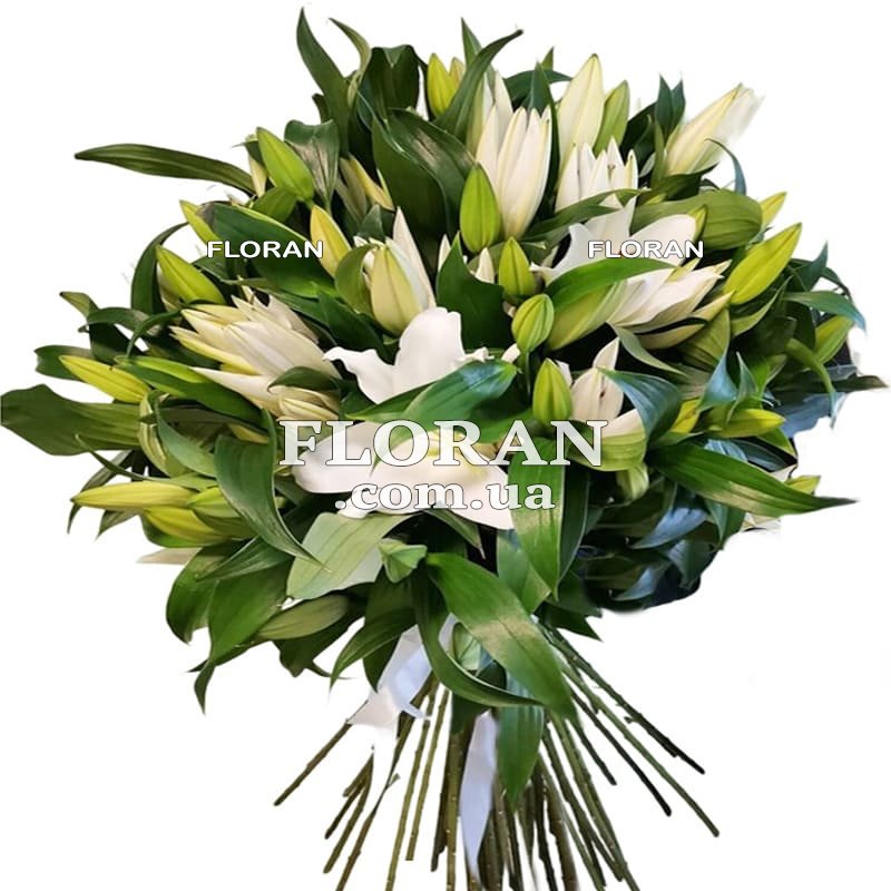 Велика кількість білих лілій наголошує на величності та значущості цього букета. Кожна квітка лілії є унікальним і чудовим твором природи, а разом вони створюють чудову композицію, яка не залишить байдужими.