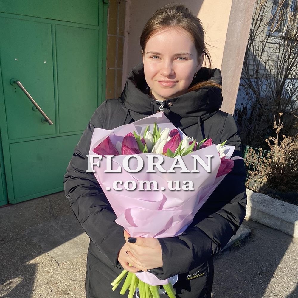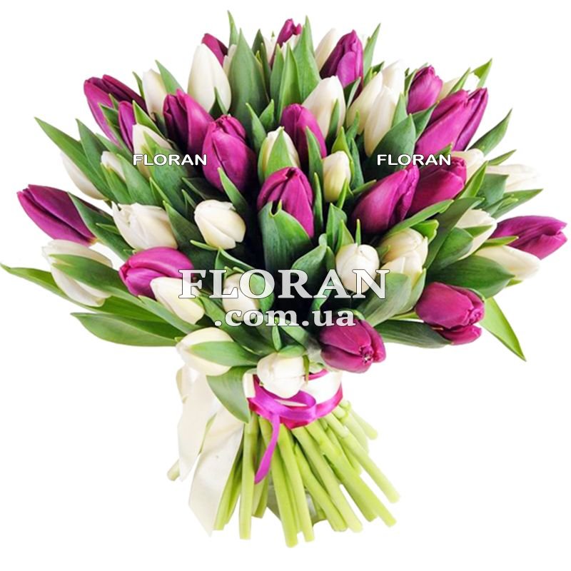 Великий букет тюльпанів - код товару FL-386. 55 білих і фіолетових тюльпанів - це прекрасний і переконливий букет, який обов'язково приверне увагу своєю красою і ніжністю. Білі тюльпани символізують чистоту, невинність і ідеальність, а фіолетові - загадковість, розкіш і витонченість. Разом вони створюють приголомшливий контраст і гармонійне поєднання кольорів. Цей букет може бути прекрасним подарунком для будь-якого випадку, будь то 8 березня, день Валентина або просто так, щоб висловити свою любов і подяку близькій людині.