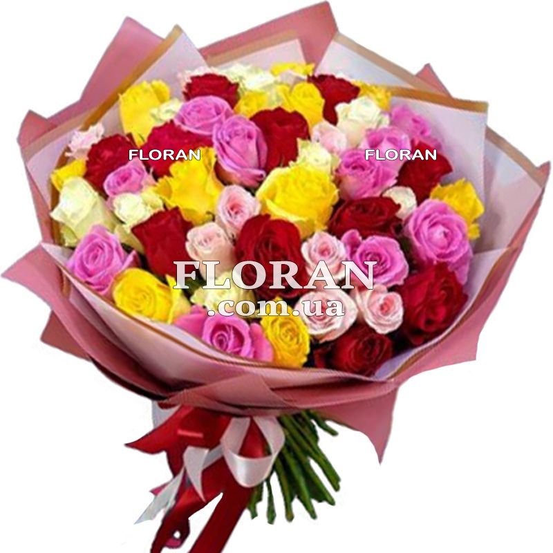 Яскравий букет із різнокольорових троянд - код товару FL-2685 - це справжня яскрава симфонія кольорів та веселки. Ось чому цей букет такий особливий: У цьому букеті зібрані троянди різних кольорів, що робить його справжнім проявом різноманітності та краси природи. Яскравість та радість: Яскраві кольори троянд, такі як червоні, оранжеві, жовті, рожеві та інші, символізують радість, веселощі та оптимізм. Велика кількість кольорів: 45 троянд - це велика кількість, яка підкреслює важливість та повагу до отримувача. Упаковка: Букет оформлений із турботою та увагою до деталей, що додає йому елегантності та виразності. Приводи для подарунка: Такий яскравий та різнобарвний букет ідеально підходить для поздоровлень, ювілеїв, свят та просто для того, щоб зробити день особливим. Емоції та Враження: Цей букет точно викликає захват і радість у одержувача. Він довго радуватиме своєю красою та спогадами про вас. Букет із 45 різнокольорових троянд - це подарунок, який зможе підкреслити радість та яскраві моменти життя. Він дарує світлі емоції та створює святковий настрій.