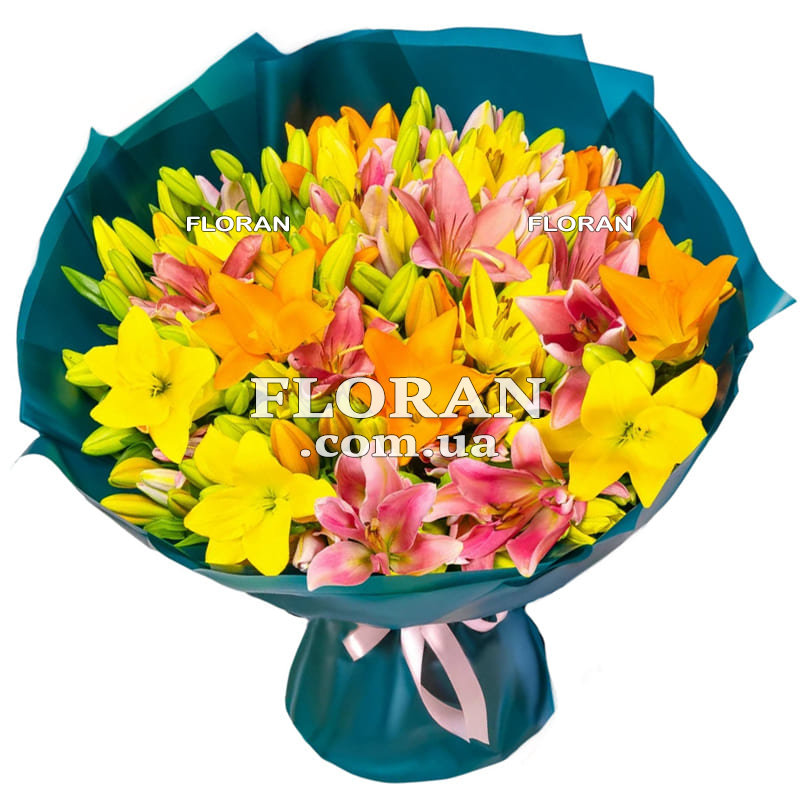 Яскравий букет лілій - код товару FL-1038. Попереду вас яскравий та чудовий букет, що складається з 45 різнокольорових азіатських лілій. У цьому букеті присутні жовті, рожеві, помаранчеві та інші прекрасні відтінки, які створюють вражаюче поєднання кольорів. Азіатські лілії є не тільки красивими і вишуканими, але й мають приголомшливий аромат. Кожна лілія в цьому букеті приваблива і унікальна за своїм виглядом, забарвленням та формою.
