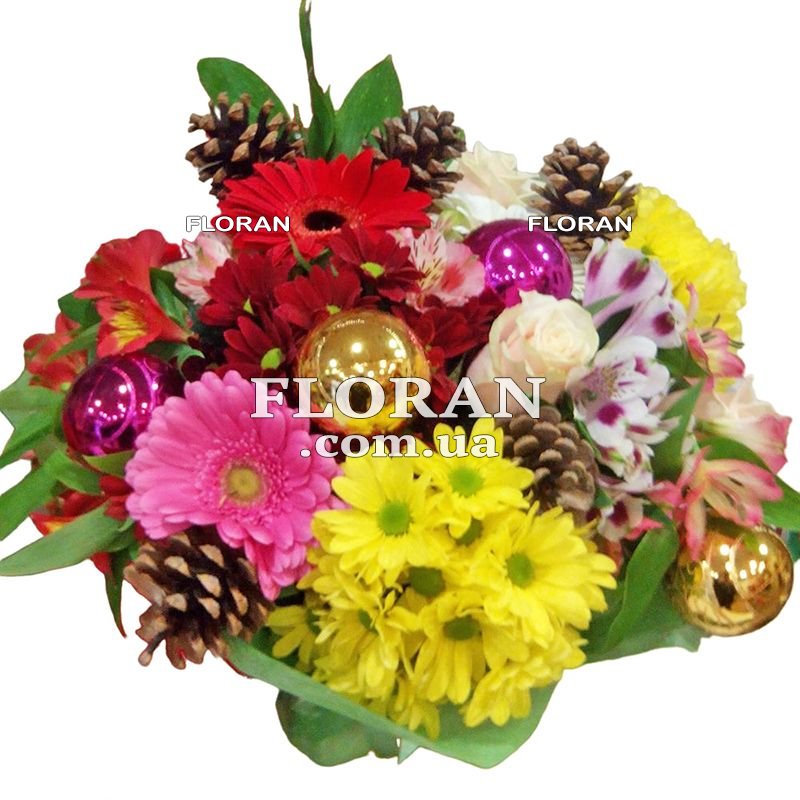 2 гербери, 3 різнокольорові хризантеми, 3 кремові або білі троянди, 5 різнокольорових альстромерій, 5 шишок, 4 ялинкові кулі, упаковка