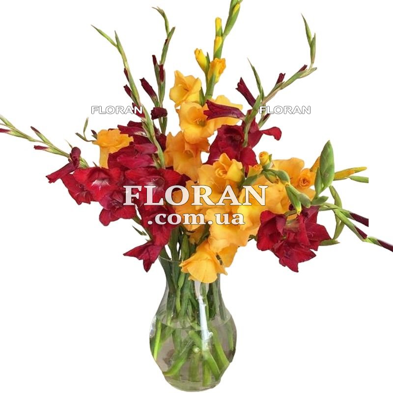 Жовті та червоні гладіолуси - код товару FL-1861. Дев'ять жовтих та червоних гладіолусів у цьому букеті створять яскраве та вражаюче поєднання кольорів. Жовтий колір гладіолусів символізує радість, сонячний настрій та дружбу, тоді як червоні гладіолуси являють собою пристрасть, любов та енергію. Цей букет підійде для різних випадків та подій. Ви можете подарувати його своїй коханій, щоб висловити свої глибокі почуття та пристрасть. Також він буде чудовим подарунком для друга чи подруги, щоб привітати їх із особливим днем або просто підняти настрій. Поєднання жовтого та червоного кольорів у цьому букеті створить яскраве та емоційне враження. Жовті гладіолуси надають нотки радості та оптимізму, а червоні гладіолуси додадуть пристрасті та енергії. Ви можете вибрати стрічку або упаковку для оформлення букета в залежності від вашої переваги. Наша служба доставки забезпечить швидку та надійну доставку цього барвистого букета до будь-якого міста України. Нехай він стане чудовим подарунком, який принесе радість та посмішки вашим близьким!