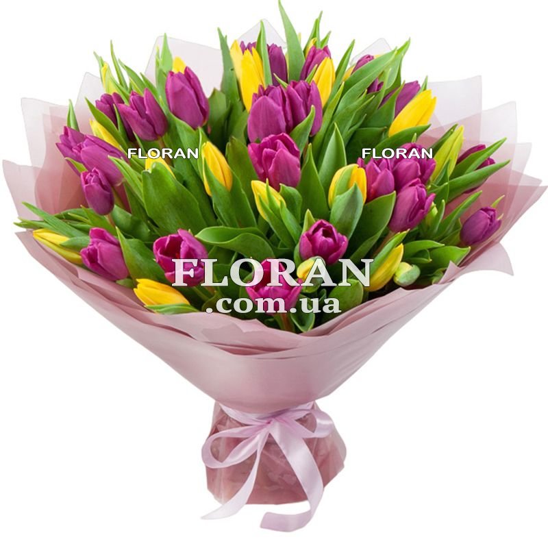 Жовті та фіолетові тюльпани - код товару FL-2399. Букет, що складається з жовтих і фіолетових тюльпанів, є чудовим поєднанням яскравості і загадковості. Жовті тюльпани символізують радість, щастя та дружелюбність, тоді як фіолетові тюльпани асоціюються з таємницею, магією та повагою. Це поєднання кольорів дозволяє передати комплексний набір почуттів та емоцій. Жовтий колір тюльпанів може бути асоційований з яскравими сонячними днями, почуттям тепла та дружелюбністю. Він піднімає настрій та приносить радість. Фіолетовий колір, у свою чергу, надає букету загадковості та інтриги. Фіолетові тюльпани можуть символізувати повагу та захоплення. Такий букет підходить для різних випадків. Він може стати чудовим подарунком для дня народження, ювілею, річниці чи будь-якого іншого свята, коли ви хочете порадувати близьку людину особливим чином. Фіолетові тюльпани також можуть бути знаком захоплення та поваги. Ми гарантуємо свіжість та якість наших квітів. Букет буде оформлений із турботою та стилем, щоб підкреслити його красу та символічне значення. Доставка доступна як у будні, так і у вихідні, щоб ви могли зробити цей подарунок у зручний час. Замовивши букет жовтих та фіолетових тюльпанів у нас, ви створите яскраве та незабутнє враження та передасте безліч позитивних емоцій.