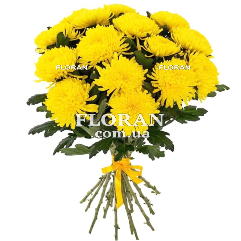 Жовтий колір часто асоціюється з радістю, оптимізмом та сонячним теплом. Він здатний підняти настрій та створити атмосферу позитиву та щастя. Букет із 15 жовтих великих хризантем стане чудовим способом висловити свою радість та подяку, подарувати частинку сонця та посмішку. Цей букет з 15 жовтих великих хризантем подарує яскраві емоції та моменти, що запам'ятовуються. Він ідеально підійде як подарунок для особливої людини, важливої події або просто для того, щоб підняти настрій та створити святкову атмосферу.