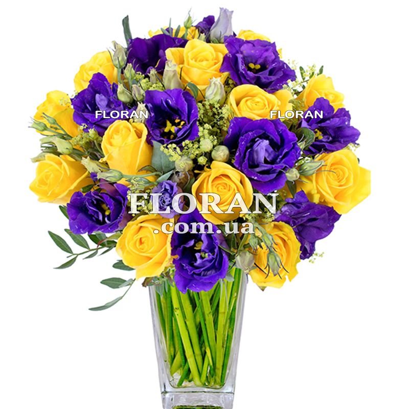 Жовто-синій букет квітів - код товару FL-253. Цей яскравий букет квітів стане прекрасним подарунком для будь-якого випадку. Букет складається з 13 жовтих троянд і 6 фіолетових еустом, що надає йому особливої вишуканості та неповторності. Це букет з троянд, хризантем і еустом, який підійде для будь-якого приводу. Жовтого і фіолетового кольору квіти гармонійно поєднуються один з одним, створюючи яскравий образ, що запам'ятовується. Якщо ви хочете замовити букет, який точно порадує одержувача, то цей варіант ідеально підійде. 13 троянд і 6 еустом - це саме те, що потрібно для створення неповторного настрою і підняття настрою. Не пропустіть можливість порадувати близьку людину яскравим і красивим букетом квітів.