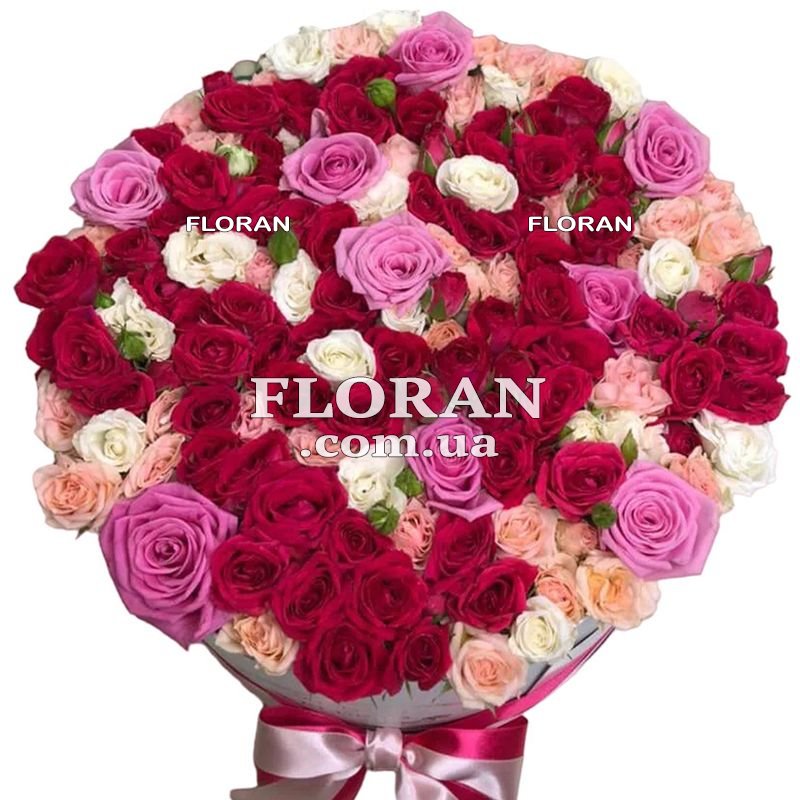 9 рожевих троянд, 42 різнокольорові кущові троянди, коробка