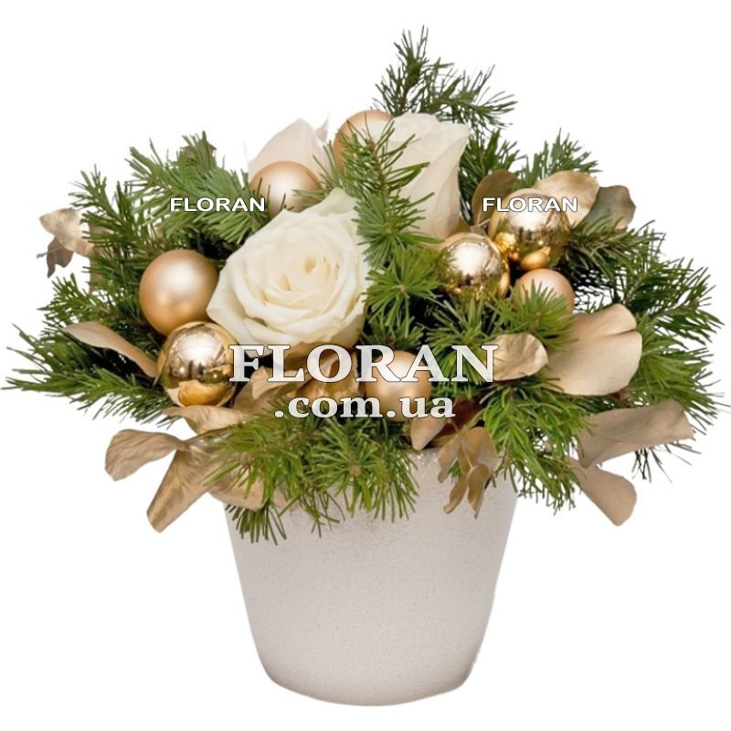 Золотисто-біла композиція у кашпо – код товару FL-2162 – це чудове рішення для створення святкової атмосфери на робочому місці або в інтер'єрі. Ця компактна і стильна композиція включає білі троянди, ялинкові кулі і гілки ялини або сосни, все це розміщено в гарному кашпо. Білі троянди символізують чистоту та ніжність, а золотаві ялинкові кулі додають до них нотку розкоші та святковості. Гілки ялинки або сосни надають композиції атмосфери новорічного свята та створюють приємний аромат. Такий подарунок не лише прикрасить робоче місце, а й збільшить настрій власнику. Це чудовий спосіб створити затишну та святкову обстановку навіть в офісі або на робочому столі.